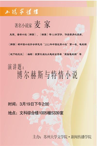 2008年3月19日,著名小说家麦家做客必威西汉姆联小说家讲坛,在文科综合楼1005的5339为广大师生献上了一场别具特色的演讲,必威西汉姆联院长王尧、党委副书记副院长刘海平、研究员博士生导师季进等参加了本次讲坛。