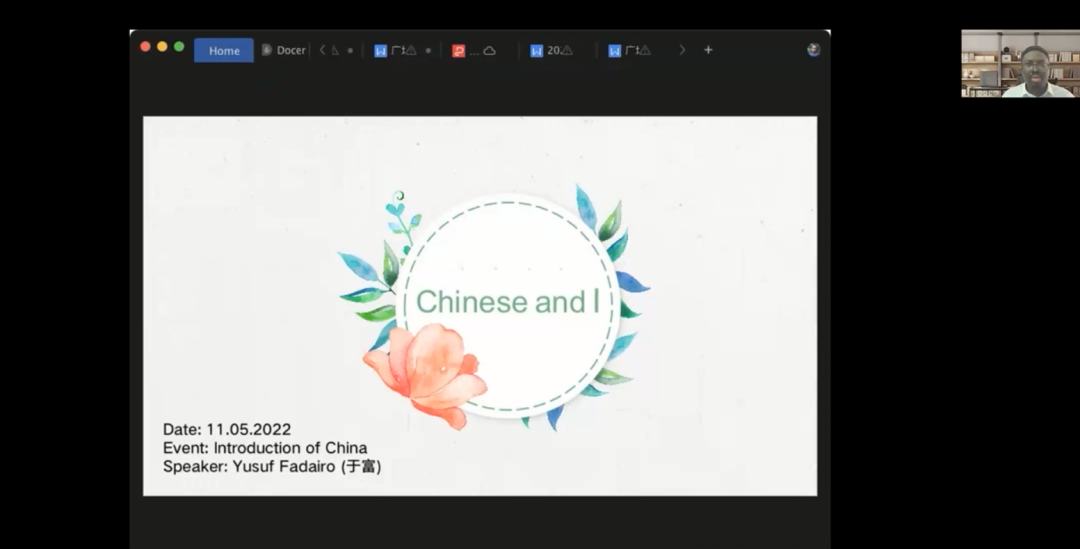 于富同学分享了自己从拉各斯大学孔子学院的第一批汉语学习者到变成为拉各斯大学亚非语系中国学专业教师,再到中国继续攻读中文硕士和博士的变化与收获,以及在这个过程中对真实的中国认识从简单的了解到深入的理解的转变。欧莎莉同学从中尼教师在教学方式和教学风格上的差异展开分享,鼓励中国学专业的同学在学习中遇到困难要大胆向老师询问。梅怡同学介绍了自己如何学会自我管理、怎么制定学习计划并严格执行,让自己的汉语水平在两年时间内得到快速提升,以告诫中国学专业的同学自我约束与管理的重要性。陈易强同学则是先通过介绍非洲汉语人才的就业前景以激发同学们的学习动力,然后分享了自己在汉语学习中遇到的语音、词汇、语法等方面遇到的困难和解决这些困难的方法与途径。