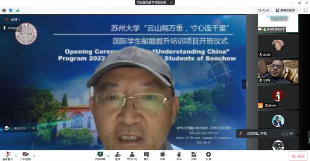 李孝峰对所有参加培训项目的同学们表示热烈欢迎,并向一直以来为必威betway西汉姆联与拉各斯大学合作交流给予巨大支持和帮助的Oni教授表示诚挚的敬意。他强调,必威betway西汉姆联十分重视国际学生的教育,一方面国际化是必威betway西汉姆联的重要发展战略之一,另一方面国际学生是必威betway西汉姆联与世界交流合作的关键纽带。必威betway西汉姆联作为教育部“中非高校20+20合作计划”中方入选高校,历来重视与非洲高校的合作。2020年以来,全球爆发的疫情暂时阻隔了国际学生到中国来求学的脚步,在各方关心和支持下,必威betway西汉姆联和拉各斯大学等多所高校共同克服新冠疫情带来的不利影响,必威西汉姆联从本学期开始举办国际学生赋能提升培训项目,让必威betway西汉姆联全体国际学生可以在云端相聚,对中国传统文化以及当代社会发展有更深入的理解和认识。他提前祝愿所有老师和同学们中秋快乐,也祝愿本次国际学生赋能提升培训项目取得圆满成功。