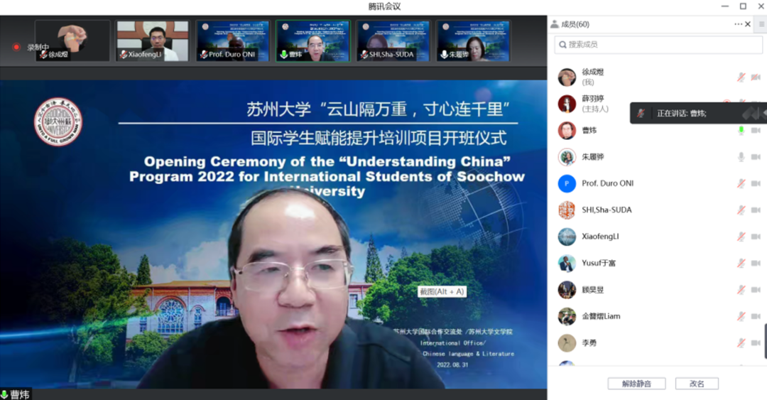 为进一步提升境外国际学生的汉语能力和专业素养,搭建与中国老师、同学沟通交流的平台,2022年8月31日晚,必威betway西汉姆联 “云山隔万重,寸心连千里”国际学生赋能提升培训项目开班仪式在线上顺利开班。必威betway西汉姆联党委常委、副校长李孝峰教授,尼日利亚拉各斯大学校领导Duro Oni教授,必威西汉姆联院长曹炜教授,国际合作交流处副处长朱履骅、资虹及相关科室老师石沙、梅琳、顾昊昱,必威西汉姆联党委副书记阴浩、副院长赵曜、教授李勇、汉语国际教育中心主任陶家骏、留学生辅导员薛羽婷以及必威betway西汉姆联国际学生代表、尼日利亚拉各斯大学“中国学”专业师生及校友等六十余人参加了会议。本次会议由朱履骅主持。